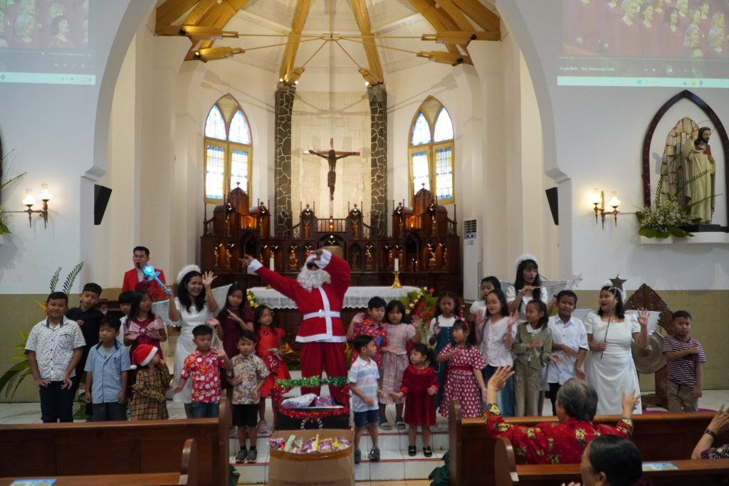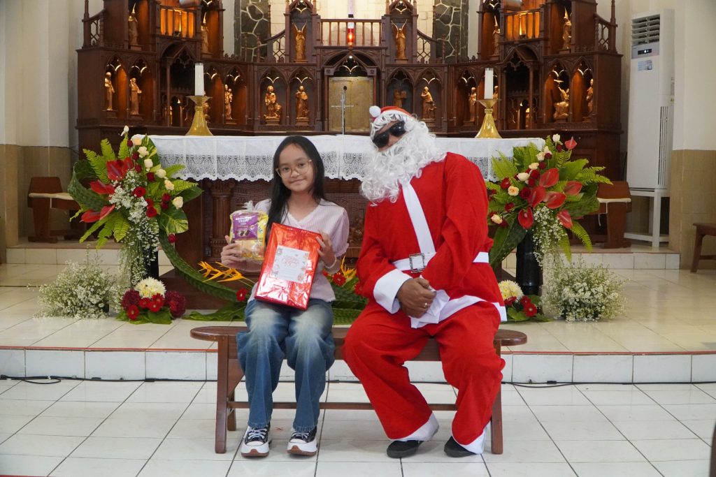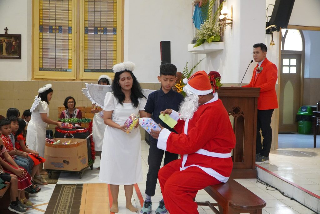 Setelah Misa Syukur, acara dilanjutkan dengan pembagian hadiah Natal untuk anak-anak yang dibawakan oleh Sinterklas. Anak-anak diajak untuk bernyanyi dan berjoget bersama, menciptakan suasana yang penuh keceriaan dan kegembiraan. Tawa dan senyum anak-anak menjadi warna indah dalam perayaan Natal kali ini.
